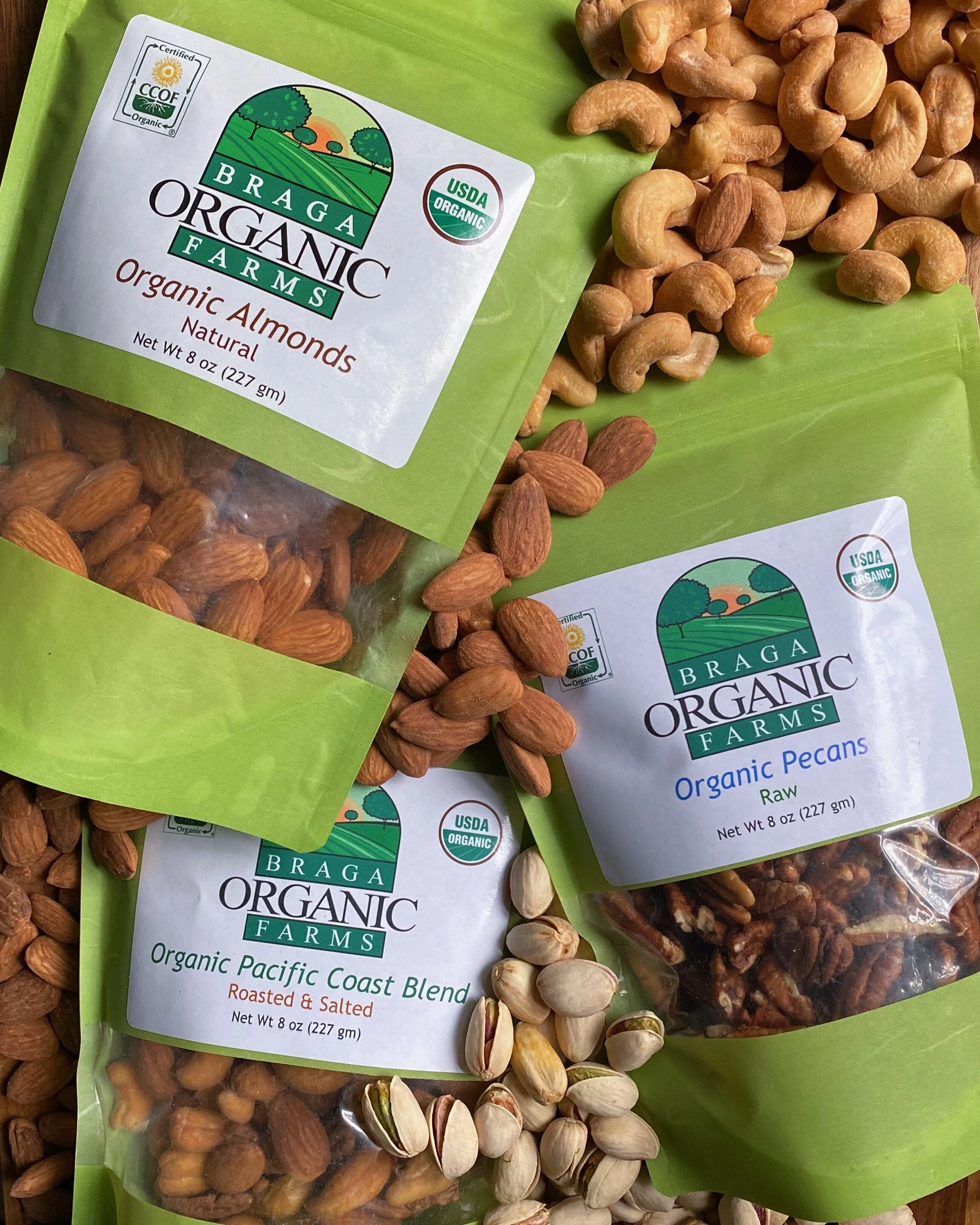 Mike Braga grows organic nuts on his 40-acre farm in Madera, CA where he farms with two of his sons. Braga was one of the first Californian nut farms to transition to organic in 2000 and has since continued their commitment to sustainability.