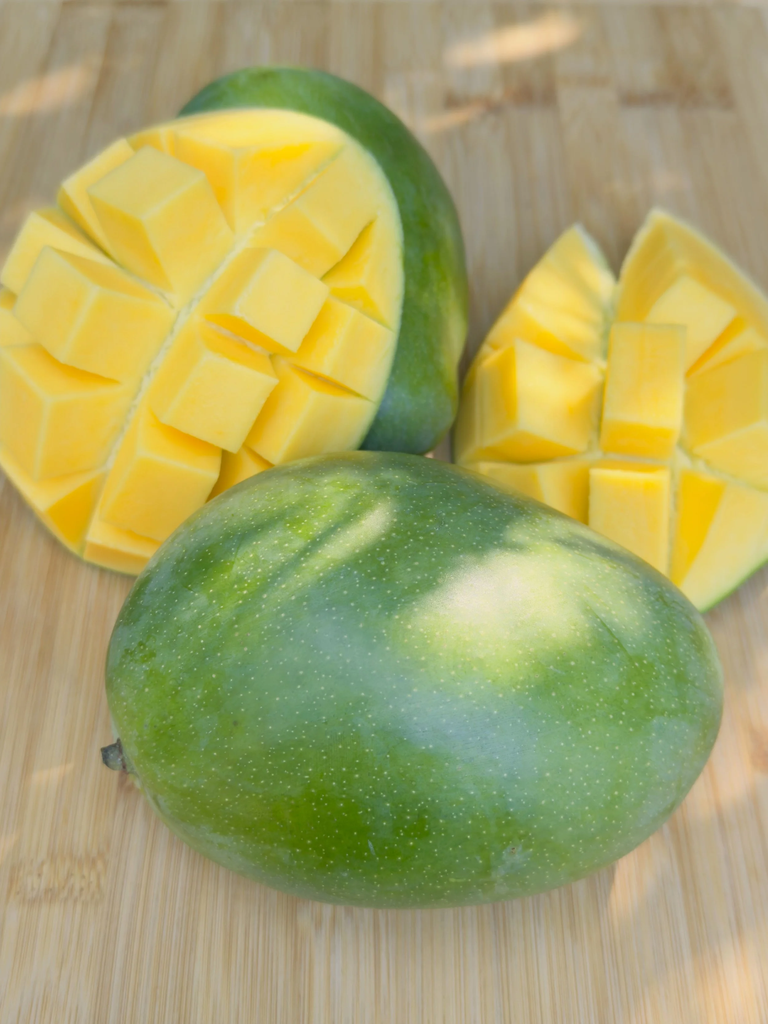 One important note: Keitt mangos stay green even when they’re ripe, so the color of the skin isn’t an indicator of how ripe and delicious the fruit is. To test for ripeness, give these mangos a gentle squeeze. If they yield slightly, they’re ready to enjoy.