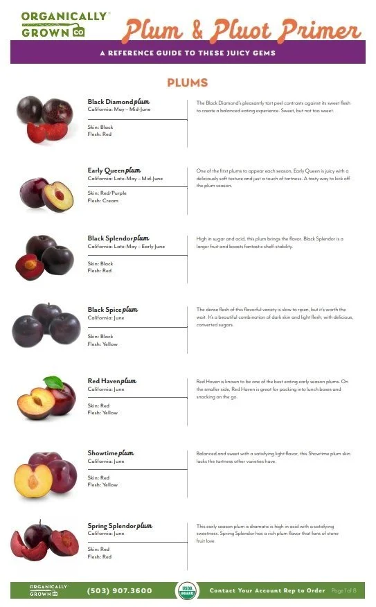 It’s an understatement to say that there are many varieties of organic plums and pluots to choose from. To guide purchasing plans and increase category knowledge, download and print OGC’s primer describing the various shades, flavor profiles and windows of availability for the over 55 gems in this delicious category.