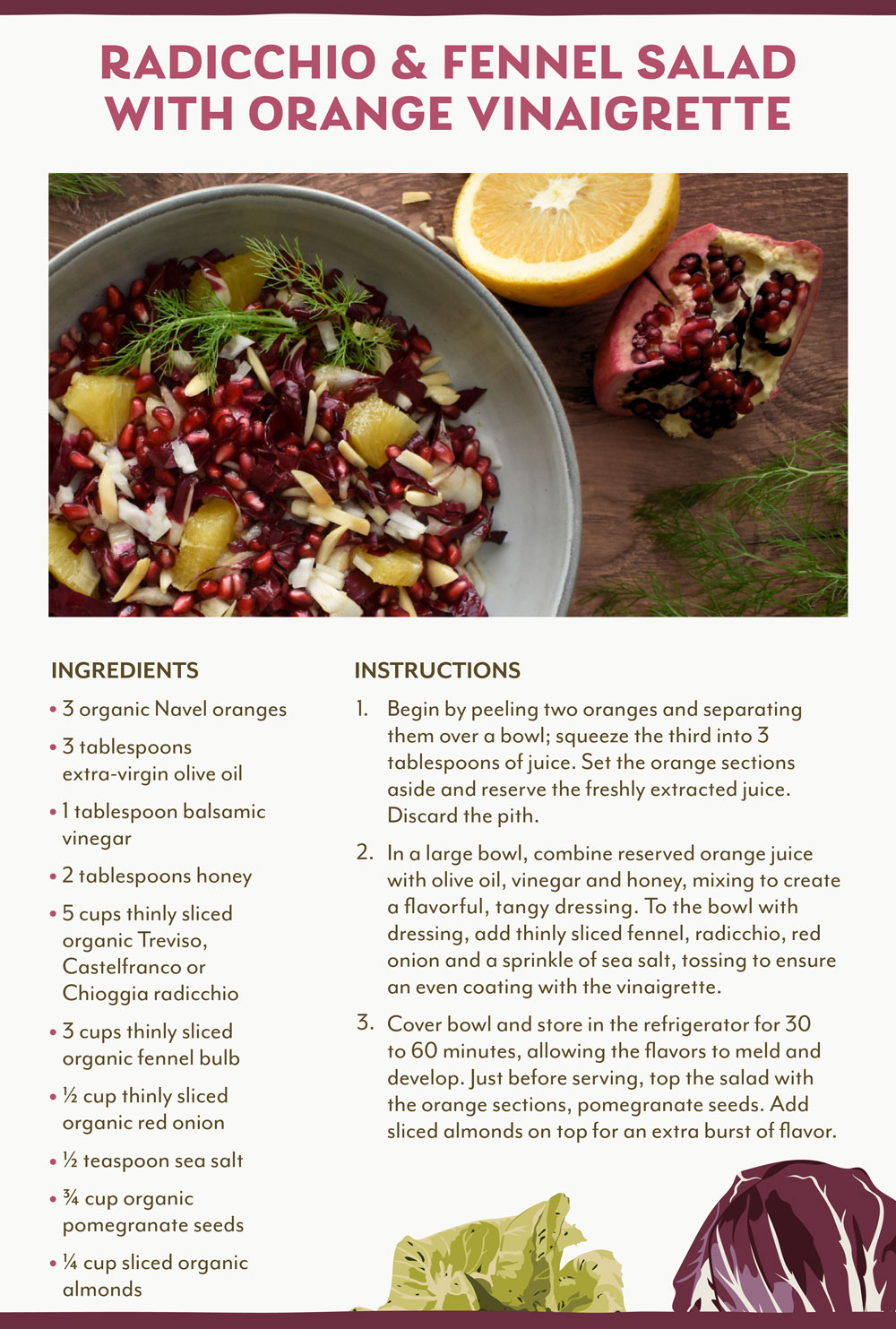 Celebrate bold winter flavors with the lively fusion of Navel oranges, white balsamic vinegar, and honey combined to create a refreshing, festive dressing that accentuates the bitter crunch of radicchio, fennel and red onion. Topped with sliced almonds and a sprinkle of sea salt, this dish bursts with flavor in every bite. Experiment with a variety of radicchio options and explore new flavor combinations starting with a seasonal radicchio salad recipe.