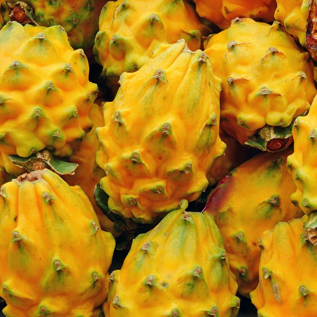 Sweet, slightly tangy and mild in flavor with floral hints, the organic yellow Dragon Fruit or yellow Pitaya boasts a vibrant yellow exterior and white flesh studded with small, edible seeds. Download the Organic Yellow Pitaya Toolkit for POP, product info and more.
